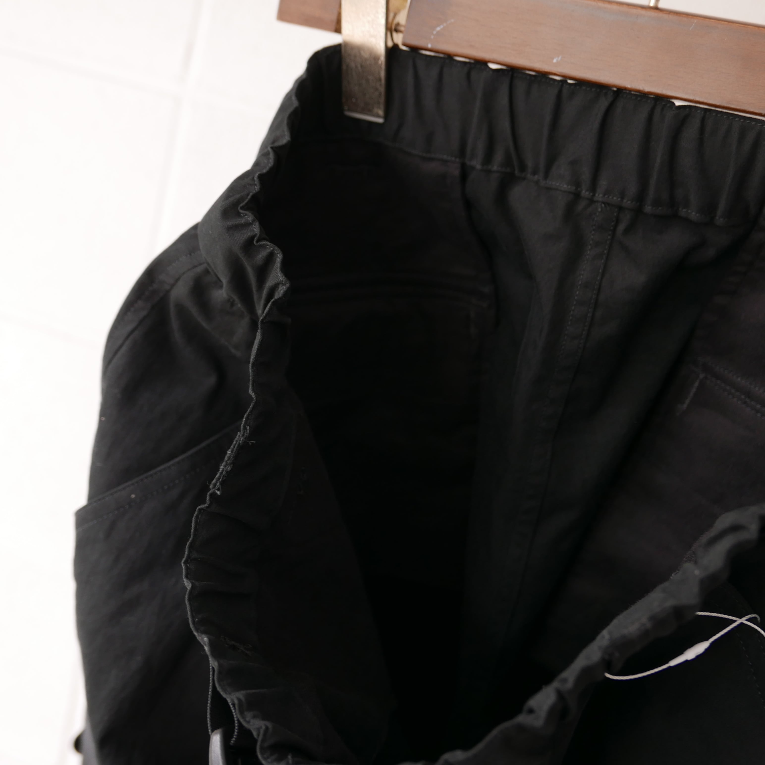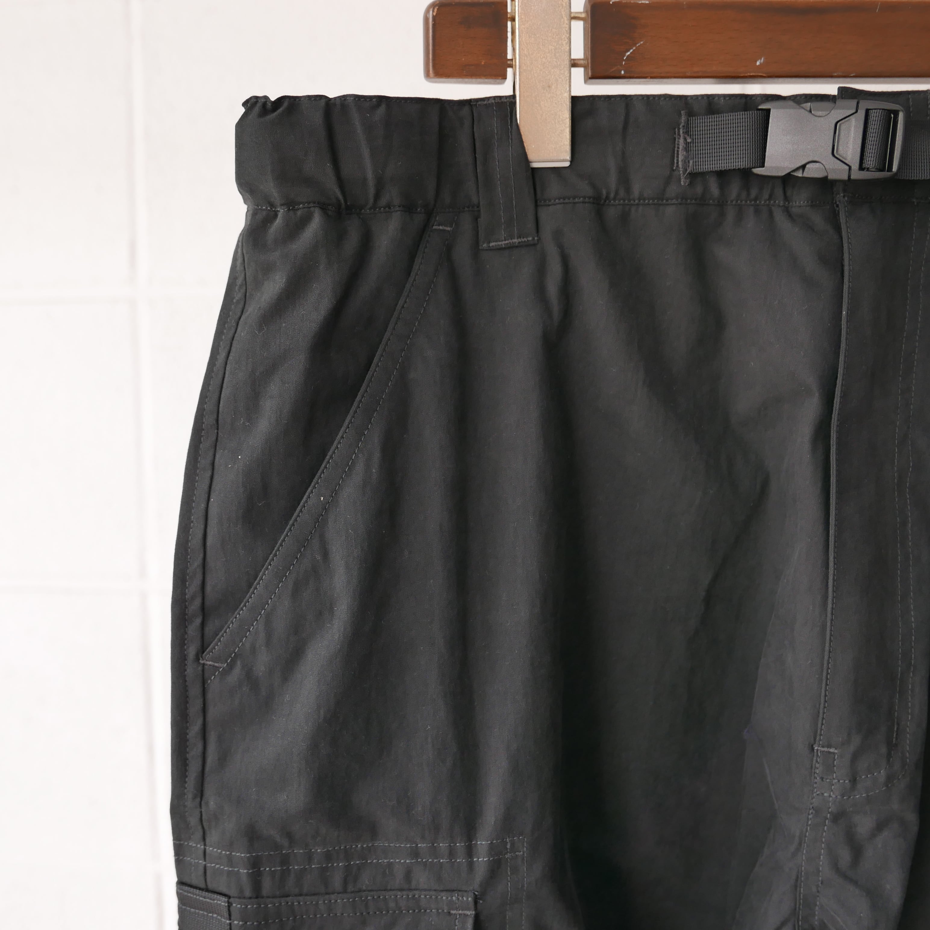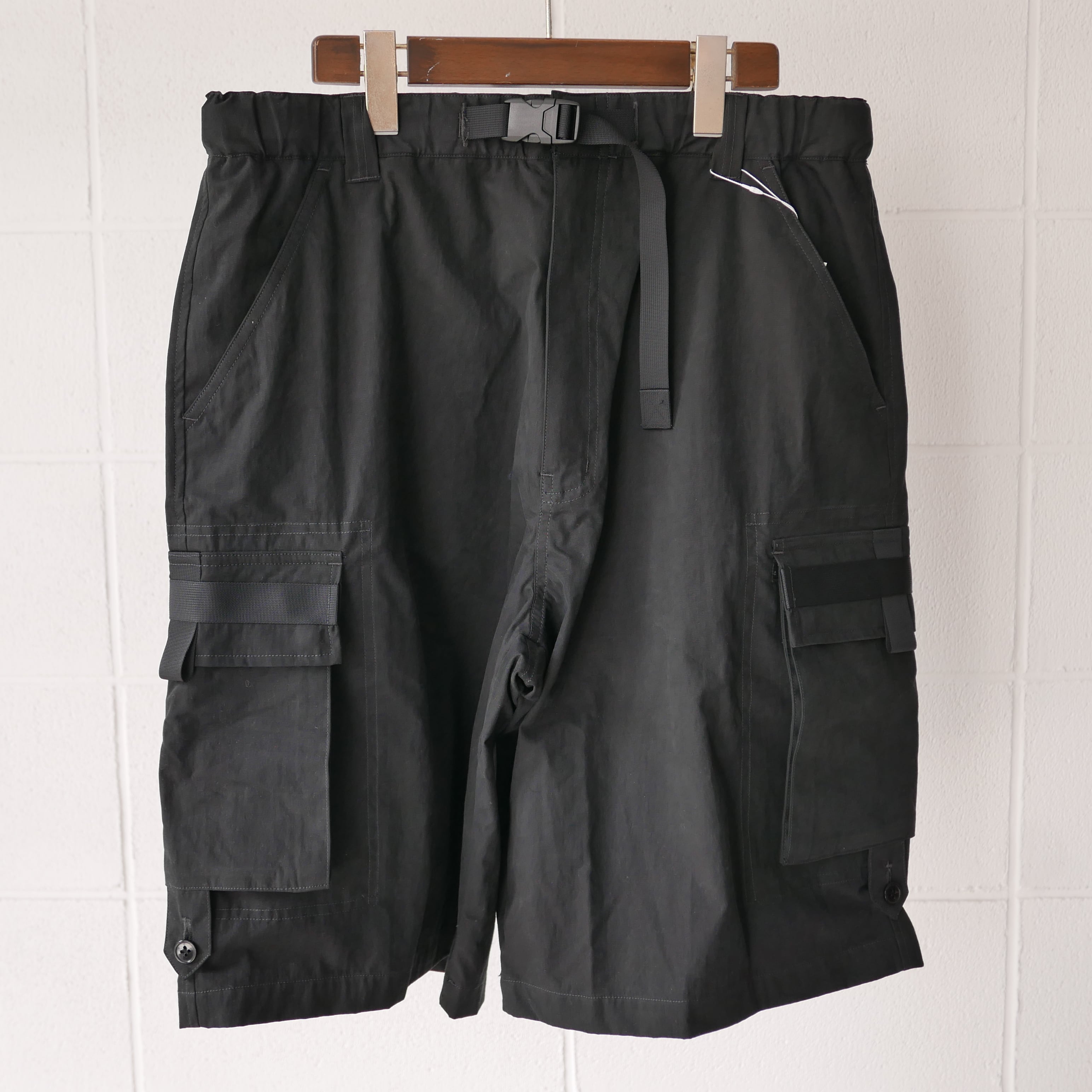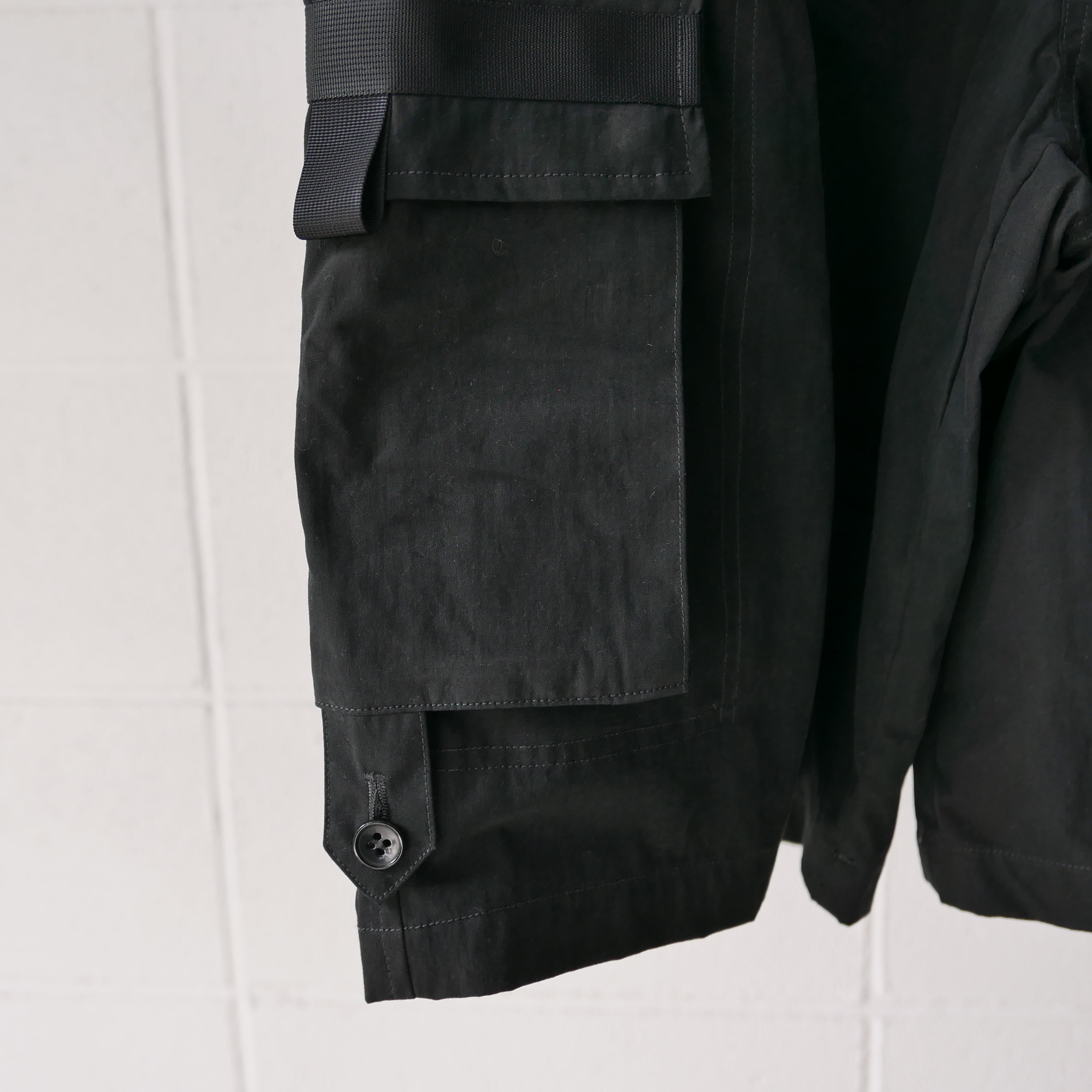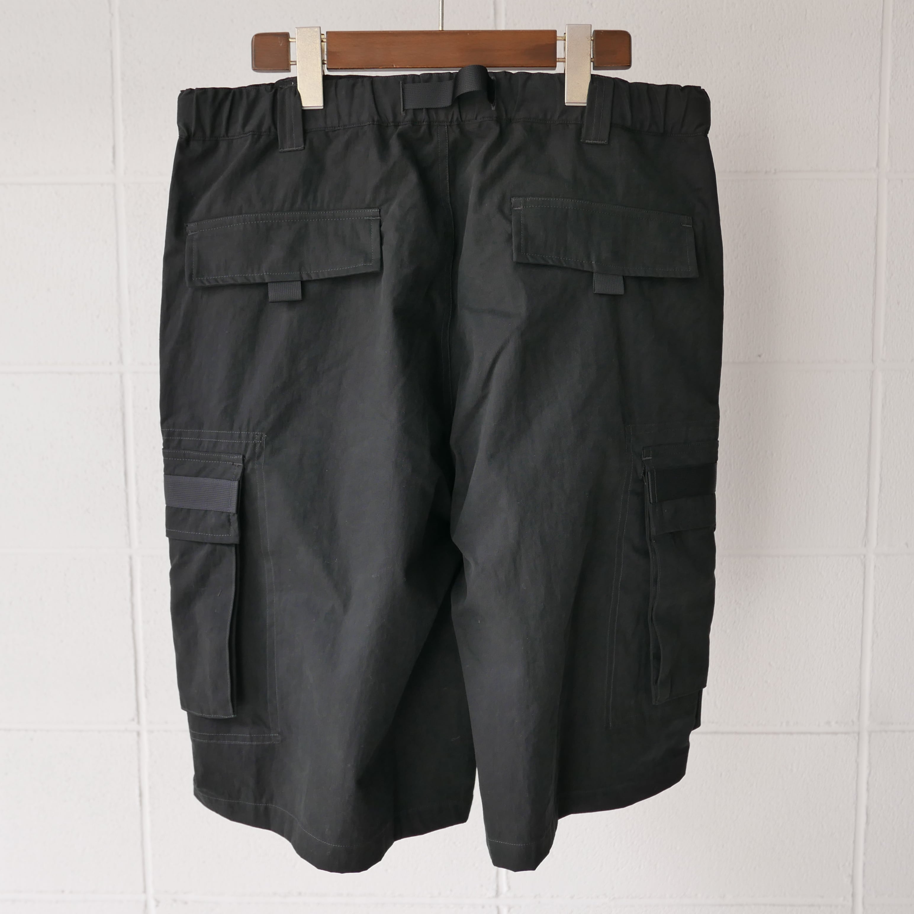 Black Cotton 73% Polyester 27% 超極細ナイロン繊維によって織り上げられたスエードレザー調素材。天然皮革に非常に近い肌触りとしなやかさが特徴。 コットンナイロン素材にピーチ起毛加工・バイオ加工を施しヴィンテージ調な表情を演出。しなやかなドレールと独特なマット感が特徴。 00年代のカーゴショーツをデザインソースとし箇所箇所にナイロンテーピングを施すことで、より現代的なファッションデザインを追求。